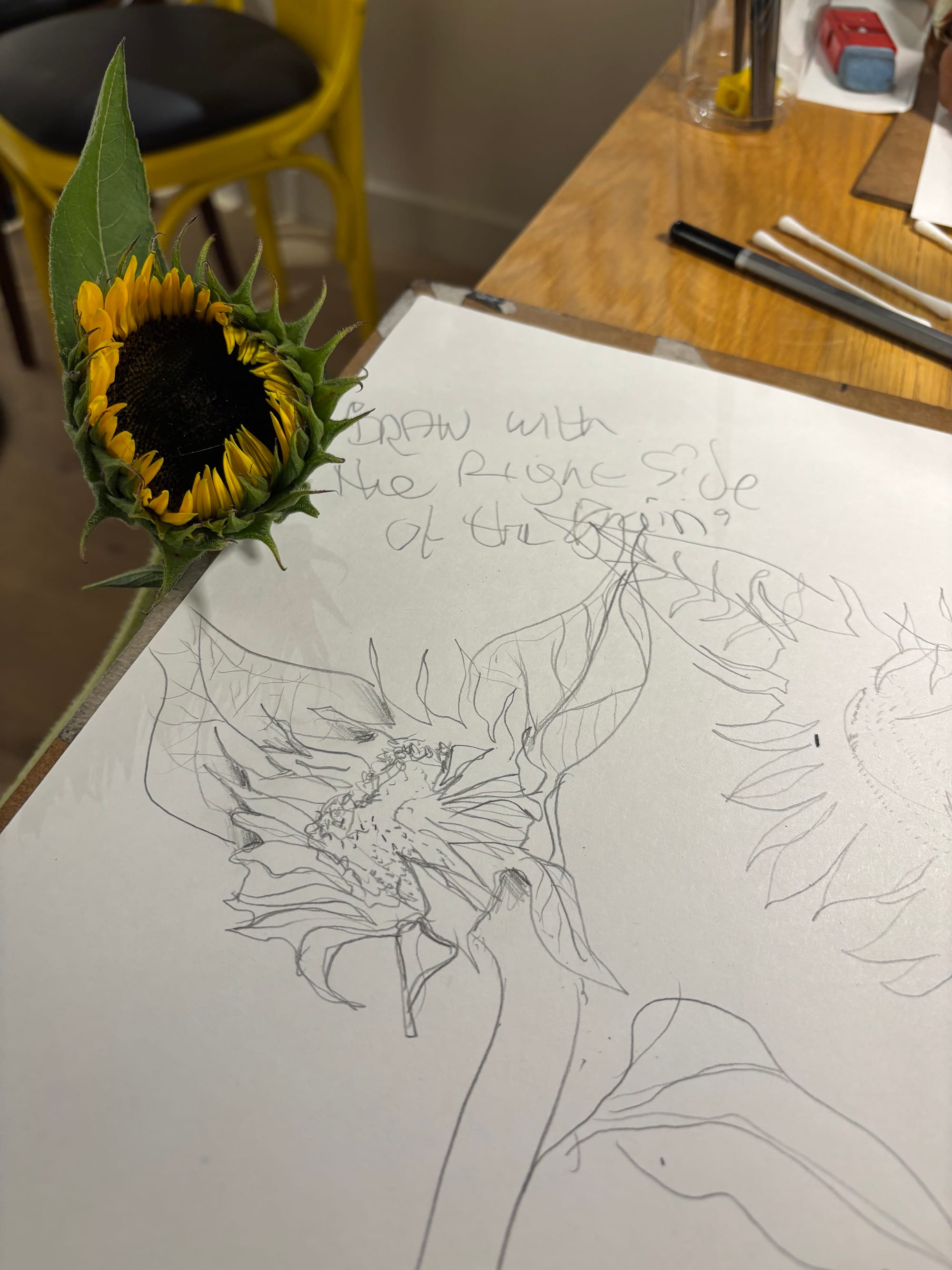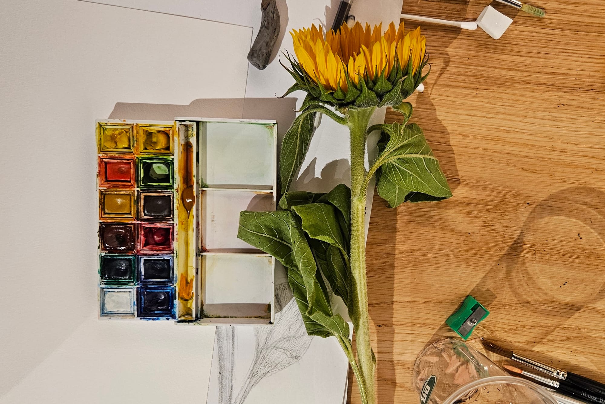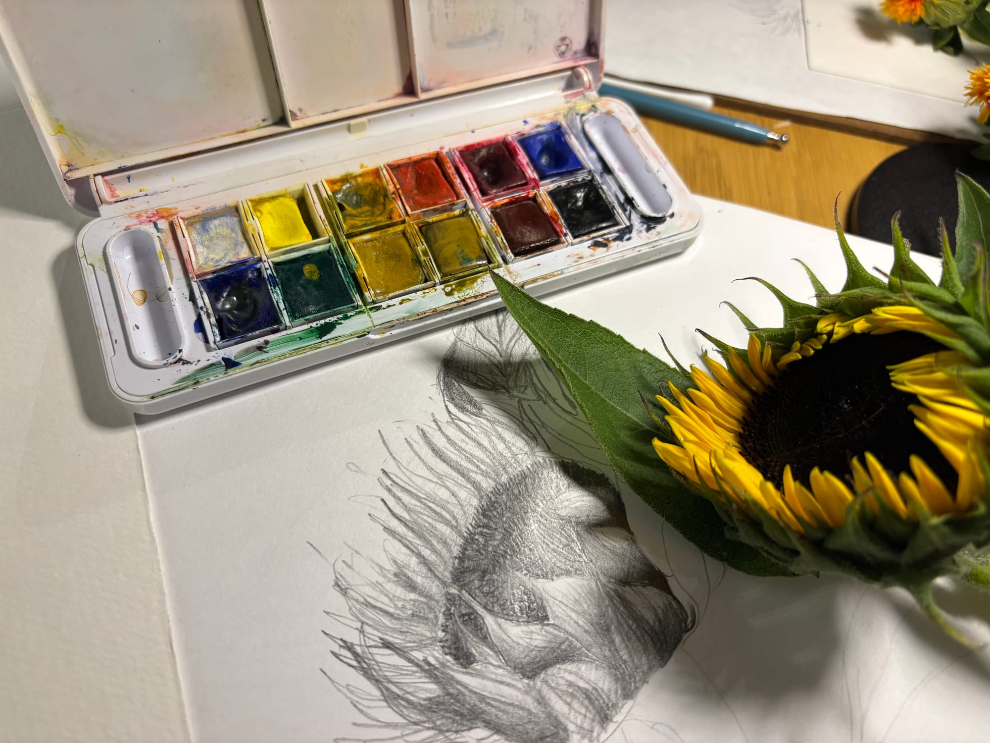 Moving from pencil to pigment, we took up our brushes and started layering colour onto our watercolour paper (once I worked out which side of the paper so use. It makes a difference you know – another lesson learnt). Here Sisetta’s painterly insight really began to shine. Her approach to watercolour was playful and thoughtful, rooted in strong foundations of contrast and colour theory. For our sunflower, she suggested deep purples in the shadow to make the yellows sing. This wasn’t just technique - it was alchemy.