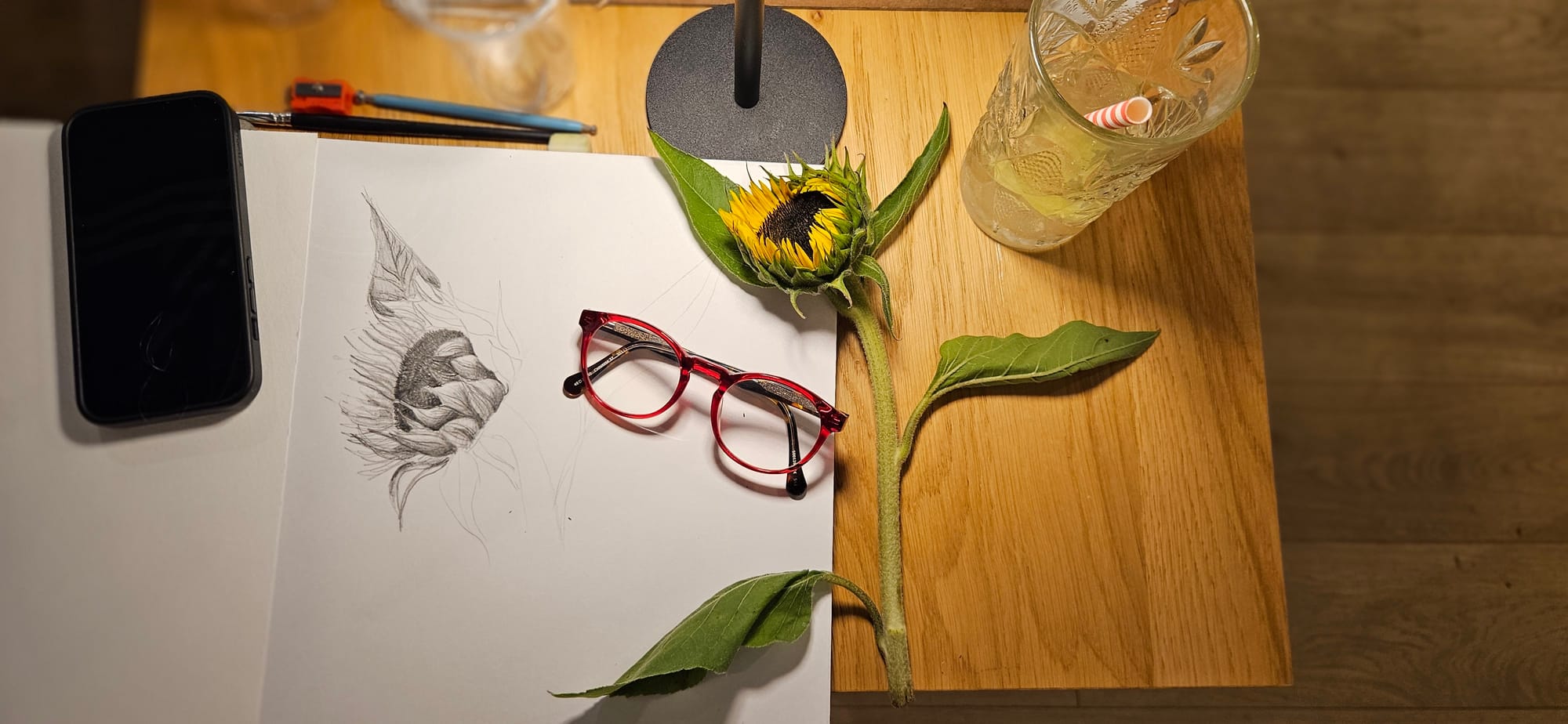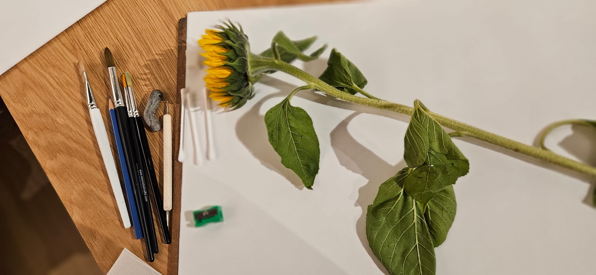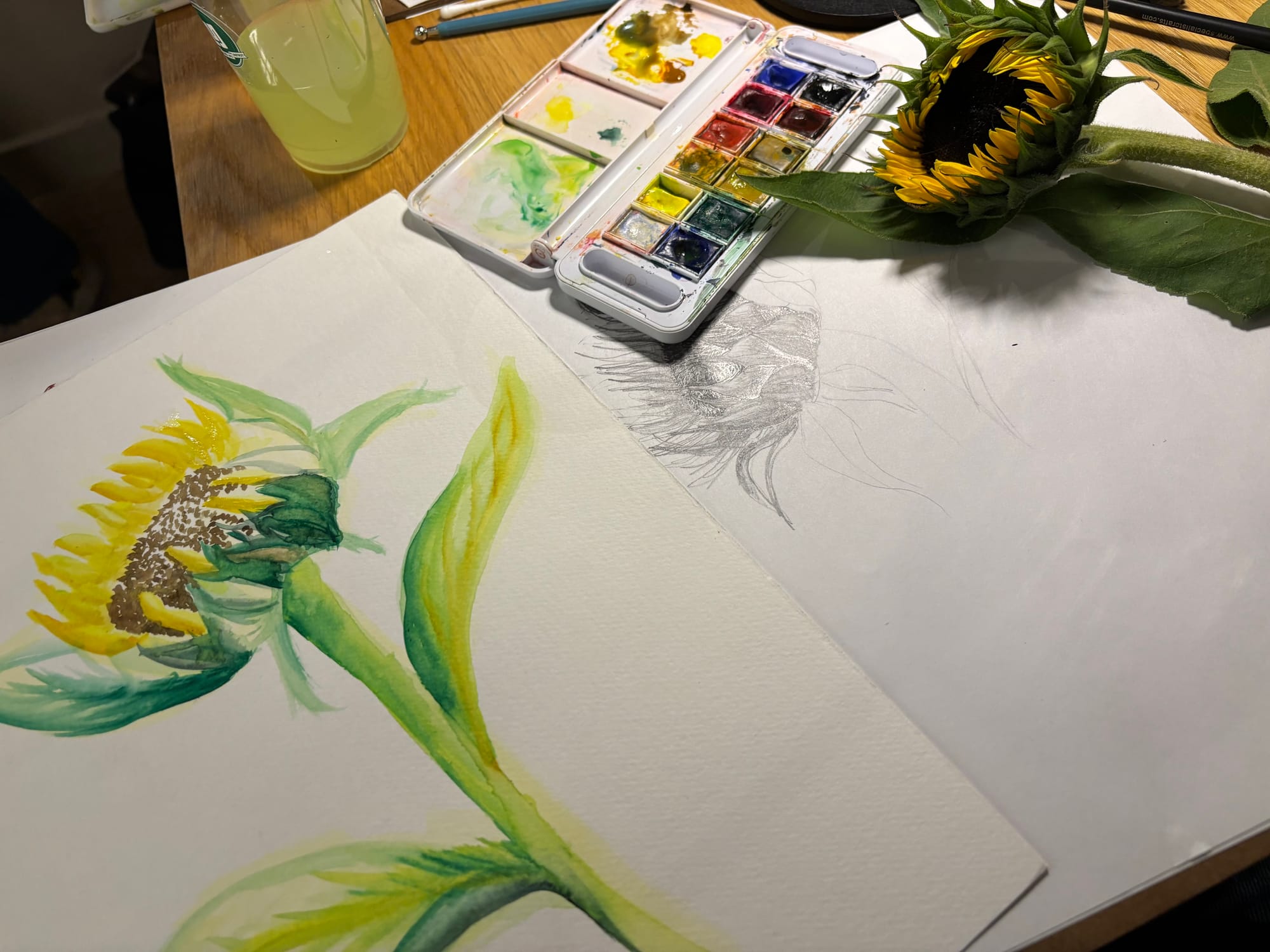 Moving from pencil to pigment, we took up our brushes and started layering colour onto our watercolour paper (once I worked out which side of the paper so use. It makes a difference you know – another lesson learnt). Here Sisetta’s painterly insight really began to shine. Her approach to watercolour was playful and thoughtful, rooted in strong foundations of contrast and colour theory. For our sunflower, she suggested deep purples in the shadow to make the yellows sing. This wasn’t just technique - it was alchemy.