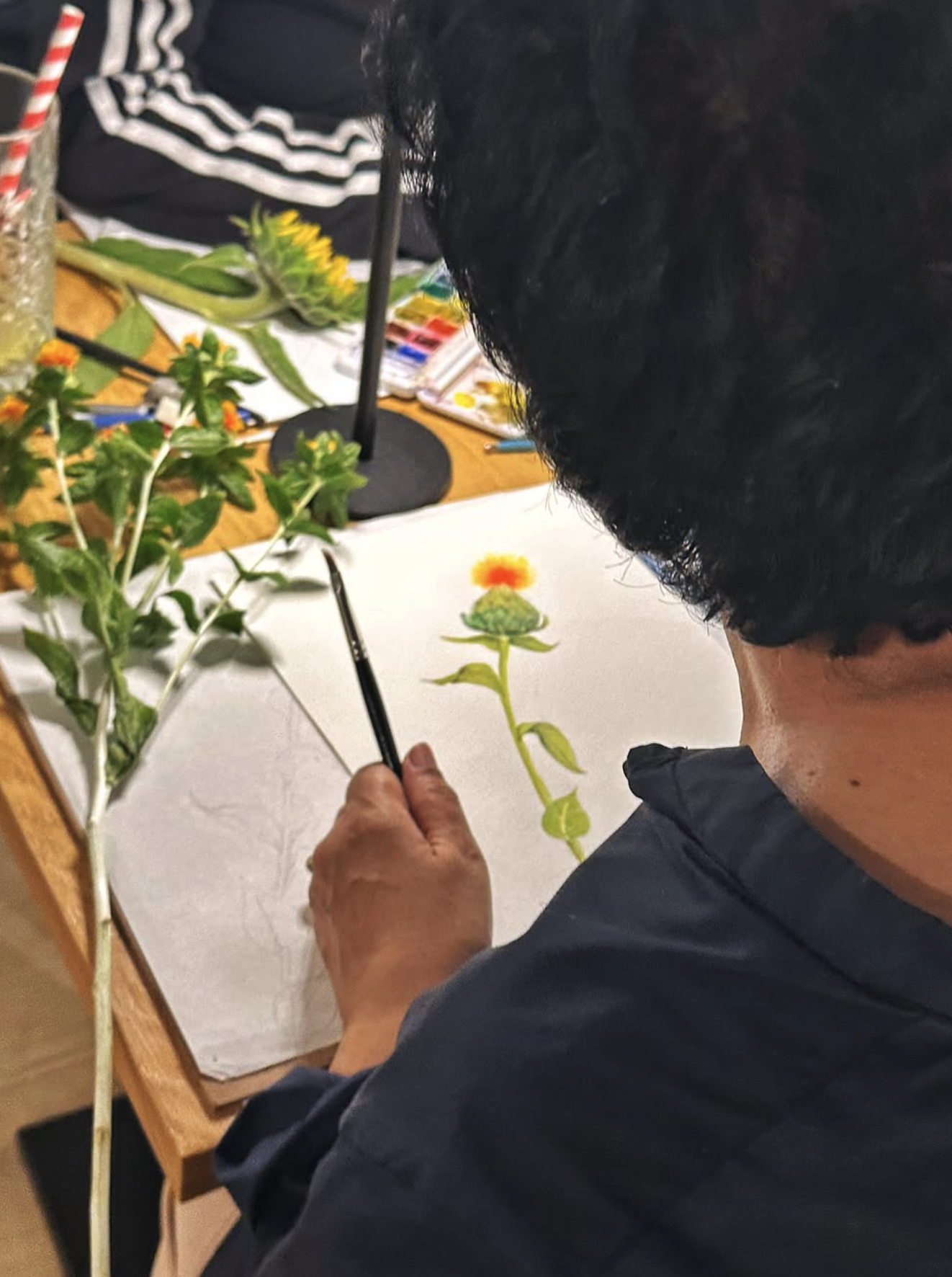 We began the session by each picking a flower from the vases Sisetta had brought along. Sunflowers, lilies, berries, large daises - all arranged like a summer bouquet waiting for stories to unfold. Before any paint was opened, we were asked to draw our flower, not by thinking about the lines or the paper, but by looking at the flower itself. As if we were, “crawling like an ant on each petal”.