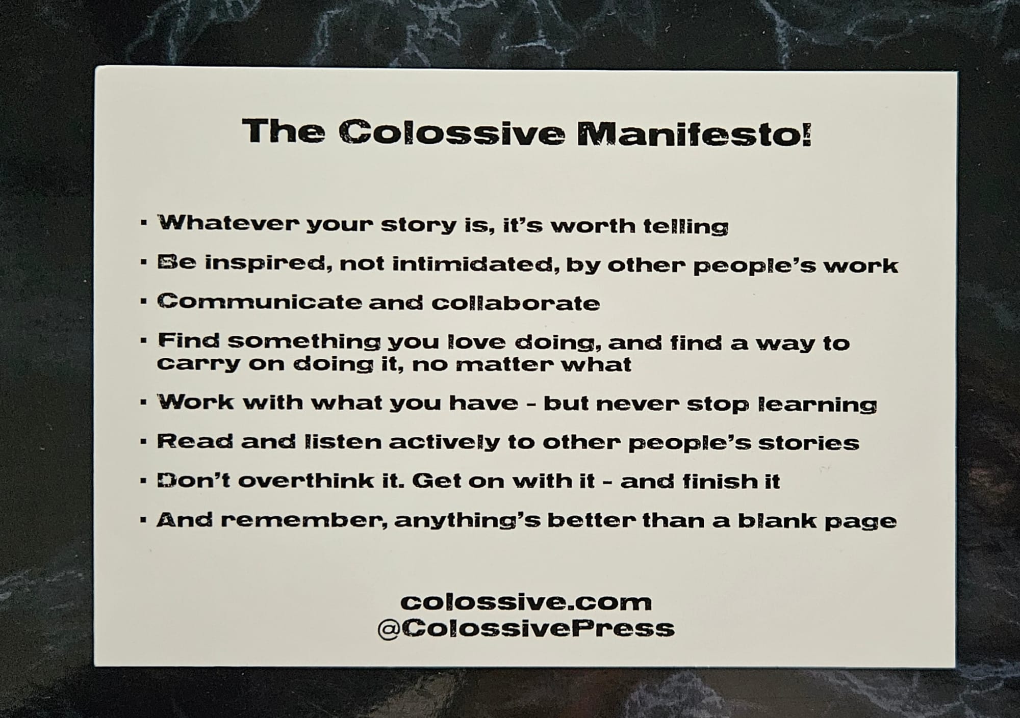 Jane: By accident really! Early in 2022, we were asked to do a short presentation for LDComics – a wonderful women-led comics forum – at their monthly online meet-up. We’d never done anything like that before, but – after the initial terror of public speaking had subsided – we managed to come up with a few core ideas about what we do and why. The main theme of our talk was: if we can do it, anyone can. Just to wrap things up, we produced a summary of the key points and jokingly called it the Colossive Manifesto.