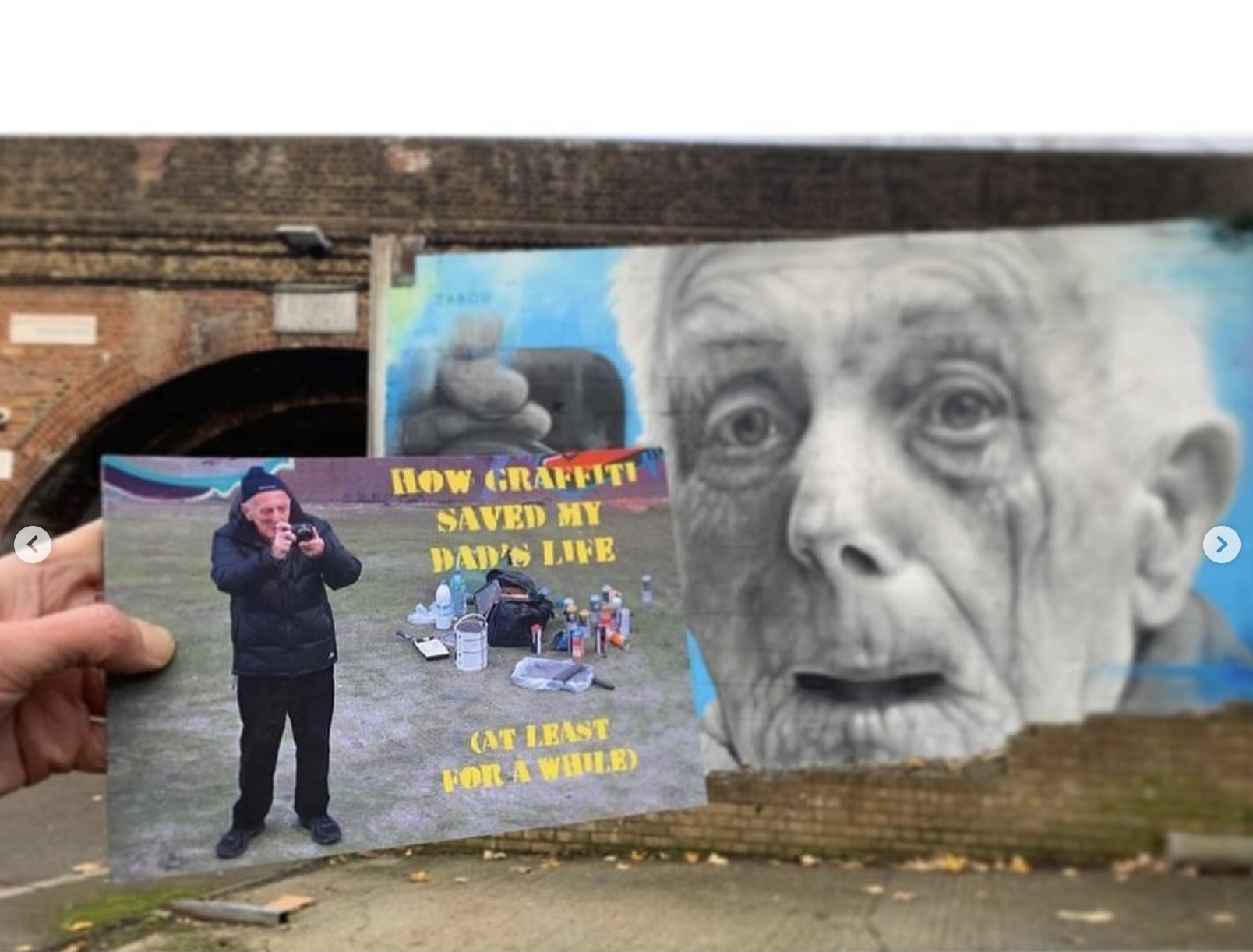 Jane: Dad was a very keen – and accomplished – amateur photographer. He was always out and about with his camera, taking pictures of anything and everything that caught his eye. Later in life, despite serious health issues, he focused on photographing graffiti and street art. He got to know all the artists and became a regular fixture on the scene. Even when he was an inpatient at St Christopher’s hospice in the last few weeks of his life, we had to take him out in a wheelchair to see the new street art in Penge.