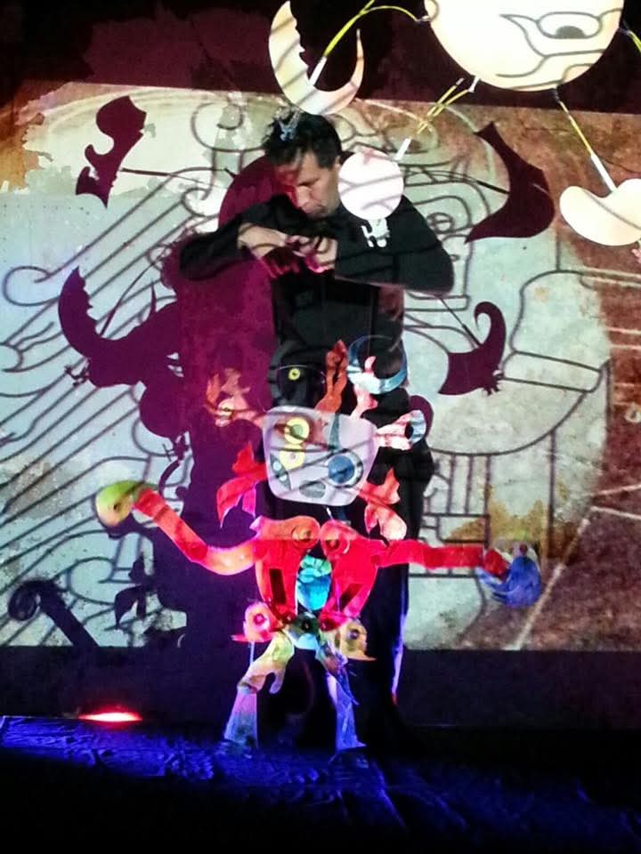 It was also around this time I started Jungian analysis. Seeing in depth through dream and my own creative practice allowed me to reinforce my work with more meaningful depth both in character and story. It was at this time I learnt the importance of workshops. I became a facilitator offering many young people the opportunity to create puppets for themselves. By the mid to late 90's I had moved to Bristol and began working with shadow. Very quickly I developed a workshop style and performance, learning from the children themselves how shadows responded well to music and sound. Eventually my workshops, being effective creative and educational tools, spread from South Wales across the majority of South Gloucestershire, Wiltshire and the South West. The format was easy to follow and effective. I produced many multicultural workshops, in particular working with the Hindu epic the Ramayana. In my professional performance work under Figure of Speech, I combined video animation with live shadow performance. Shows such as 'Rama' played well at festivals, driven by trance and various oriental rhythms. I worked with a number of musicians to discover new ways of presenting puppets on screen to new audiences. New materials I still use today became vital alongside my general creative development in this field. By 2007, David Currell had included much of my work in this arena in his book Shadow Puppets & Shadowplay. The book is a landmark publication in its field, and puts my work on the world puppet stage for the first time.