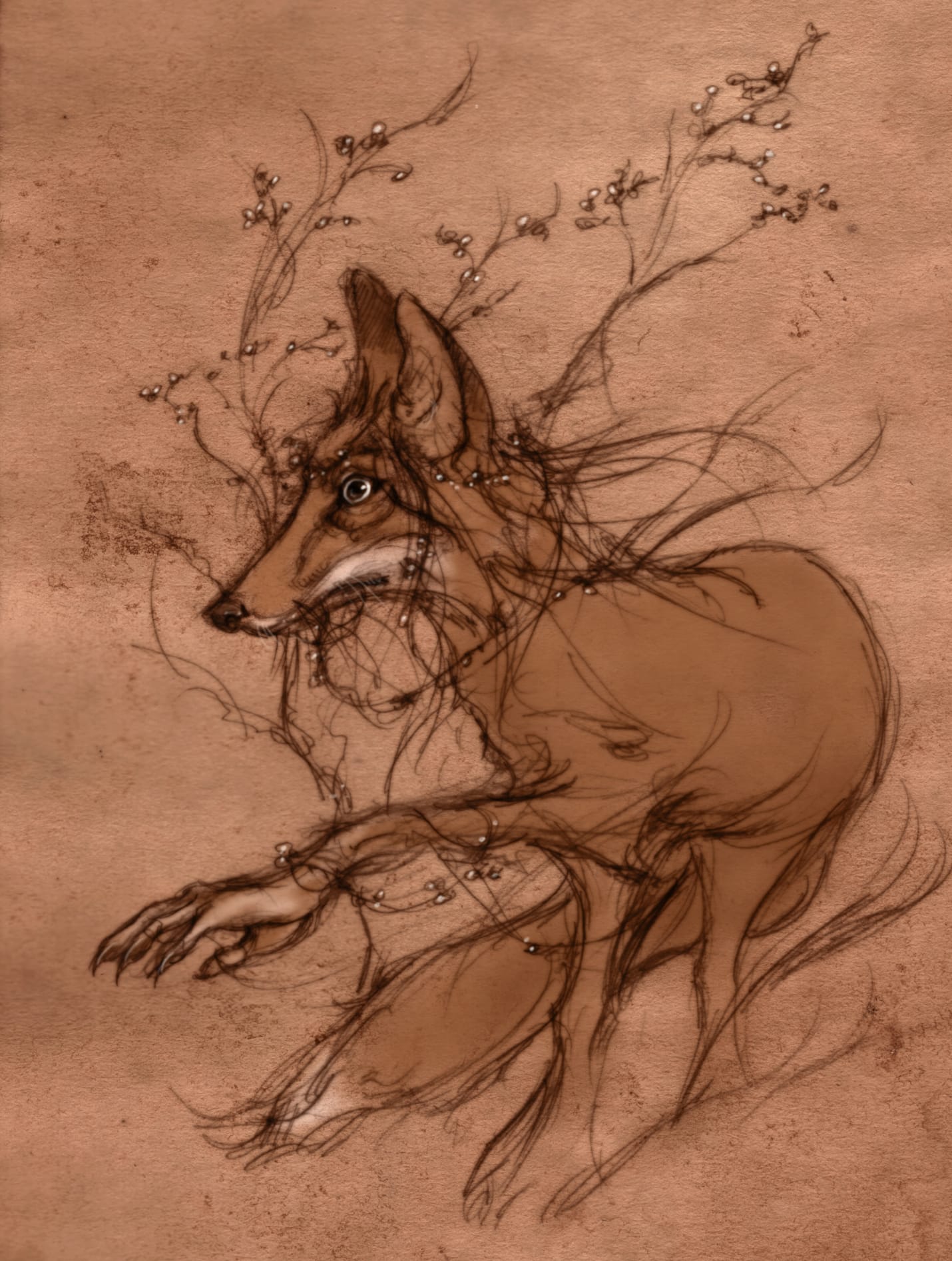 It's what works best for me at the moment. Pencil, chalk, ink wash, white pen on toned paper allow me to work in two directions tonally and still keep subtlety and detail. At every chance my method will continue to evolve. I used to work primarily in pen and ink, and I think I'll want to get back to that soon. Also, gold leaf and silverpoint are things I want to explore again. Currently, I colour digitally but that too may change.