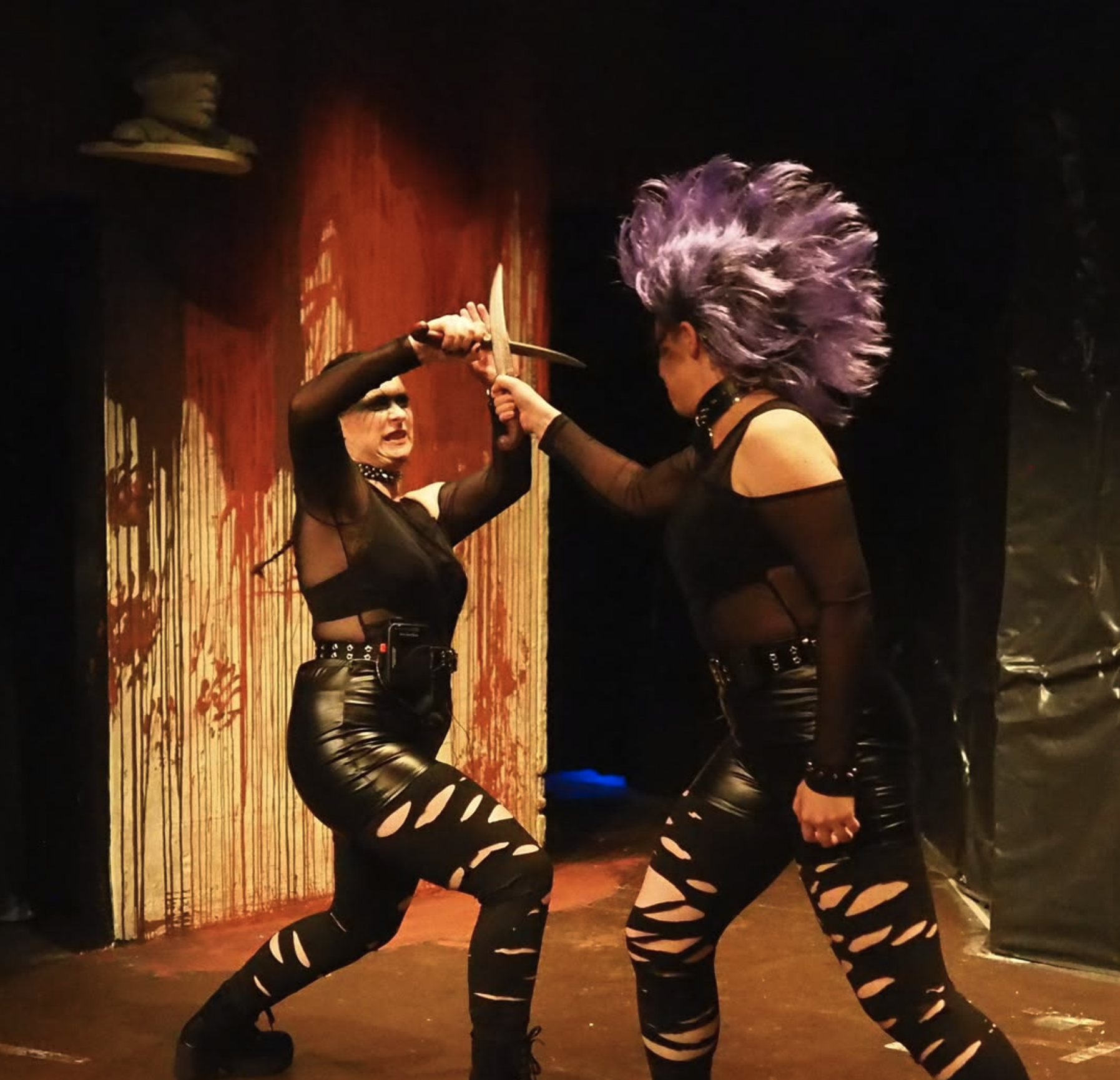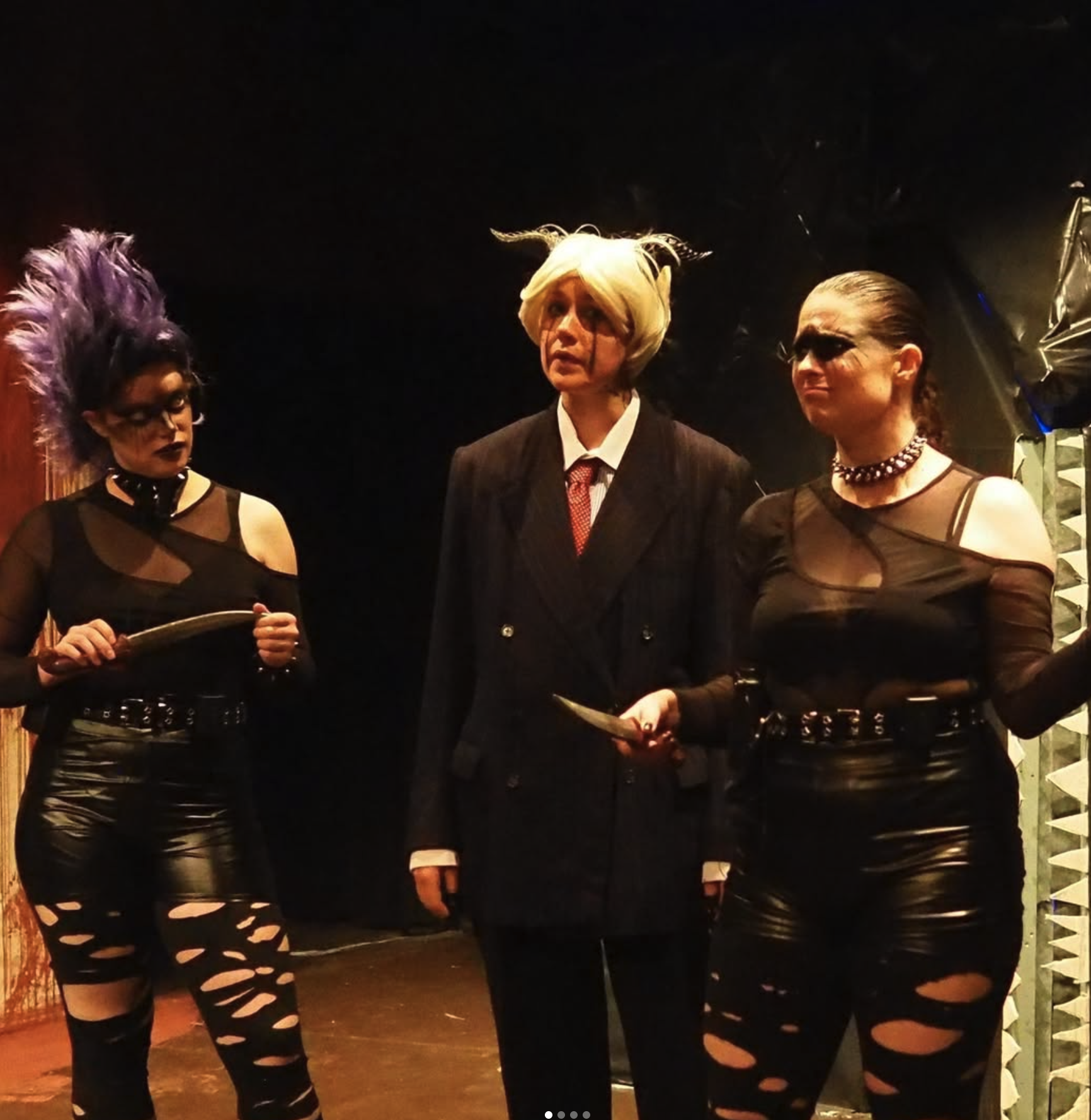 The first thing that struck us was the visual design. Progress Theatre’s team committed fully to an 80s-punk aesthetic: leather trousers paired with denim, studded accessories, and bold hair - including a standout purple punk mohawk that became almost a character in its own right. This decision wasn’t merely decorative; it helped locate the production in a world where rebellion, excess, and theatricality coexist naturally with Shakespeare’s violent political landscape.