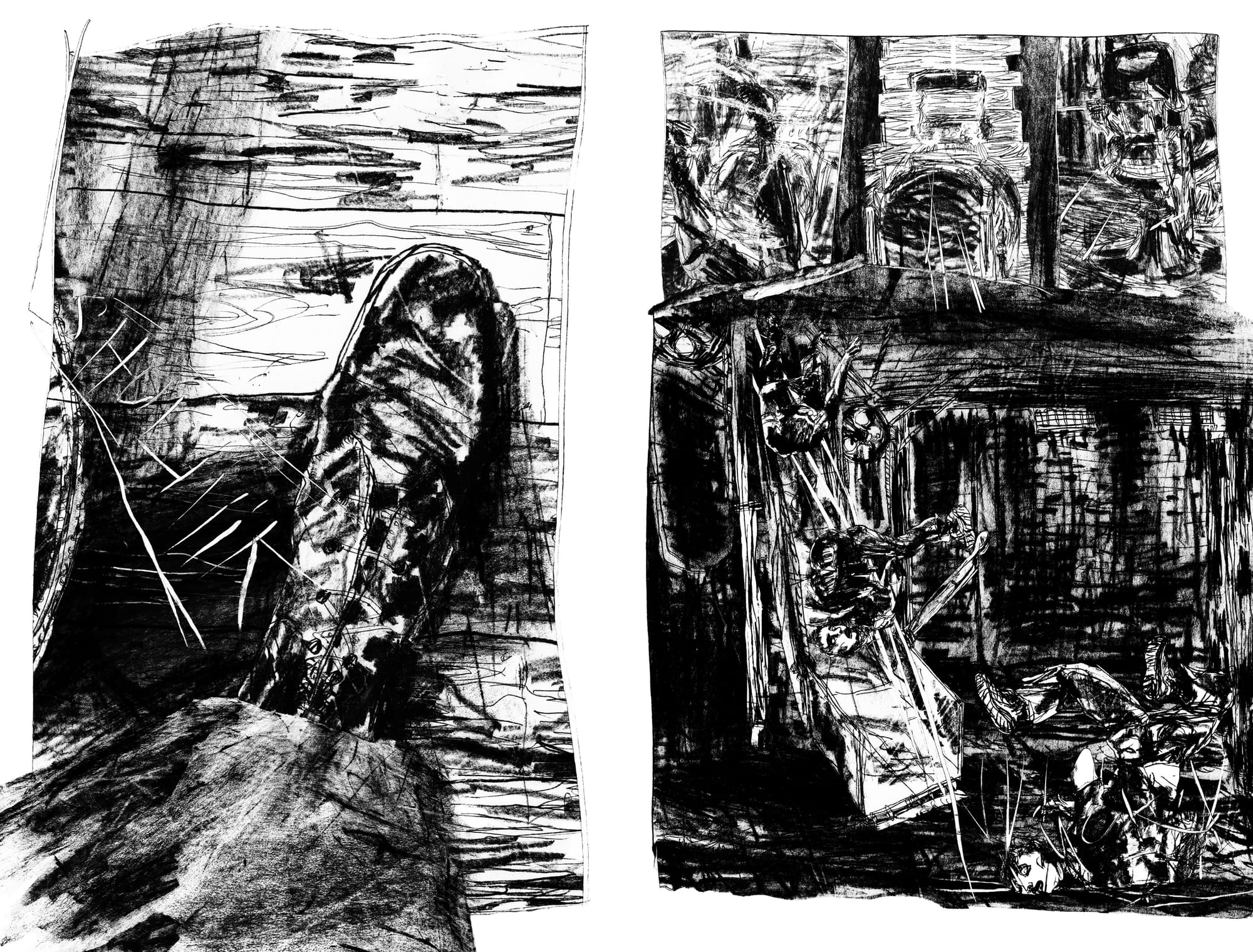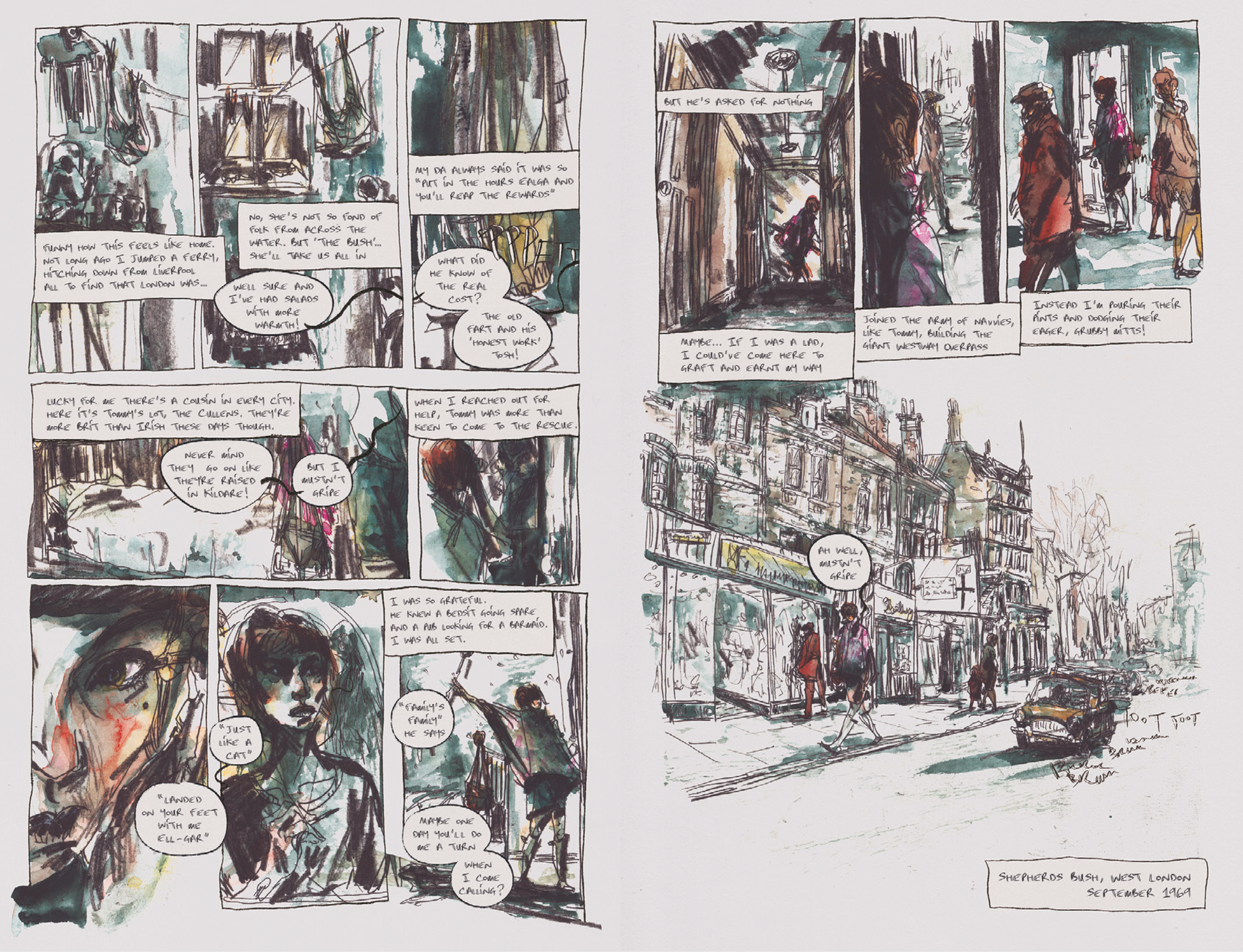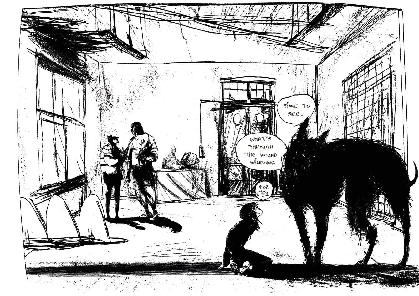 I started researching as a practice whilst making Barking as there were aspects of the mental health sector I wanted to get factually right. Particularly practices on hospital wards and how patients are treated in often brutal ways. Since then it’s become an early stage in every project. I’ve used visual research such as film and comics since I started as a creative professional. Adding research to my stories does definitely underpin them and add a weight that they could otherwise lack. It gives you a solid foundation to set in reality that then allows you to take glorious flights of fantasy. The same goes for drawing. If you can give the reader something they recognise… a skyline, a certain quality of light or familiar object then you can take them to extraordinary visual places.